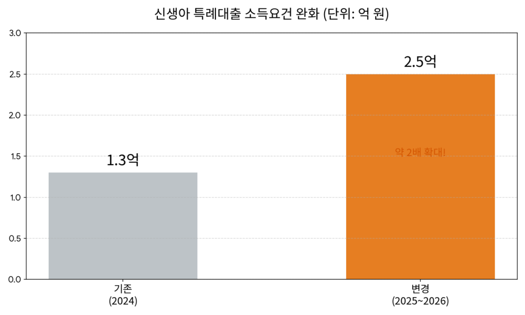 • 변경(2025~2026): 부부 합산 연소득 2.5억 원 이하 (한시적 완화 적용)