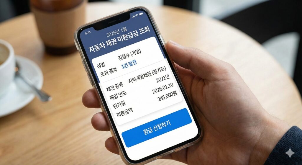 자동차 등록 시 의무적으로 매입하는 지역개발채권(지방) 또는 도시철도채권(서울·부산 등)을 말합니다. 5년~7년 거치 후 원금과 이자를 돌려받을 수 있지만, 청구하지 않으면 소멸시효(원금 10년, 이자 5년) 경과 후 권리가 사라집니다. 2026년 현재 스마트폰 뱅킹 앱으로 즉시 환급 신청이 가능합니다.