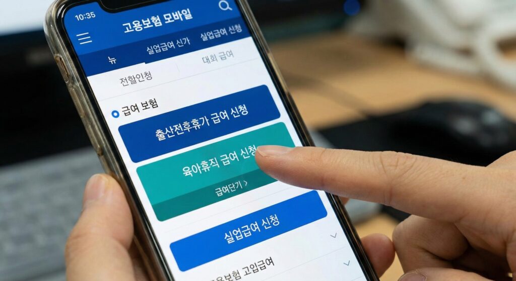- 메인 화면에서 [출산휴가·육아휴직] > [육아휴직급여 신청] 클릭.