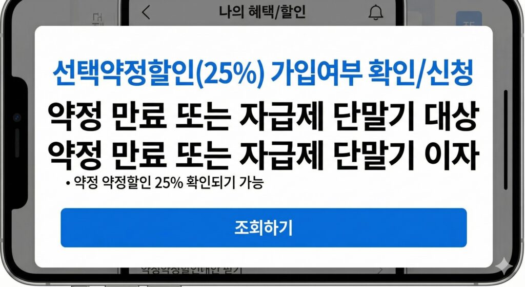 2. 선택약정 25%: 약정 끝난 폰, 자급제 폰은 누구나 신청 가능 (1년 단위 재약정 추천).